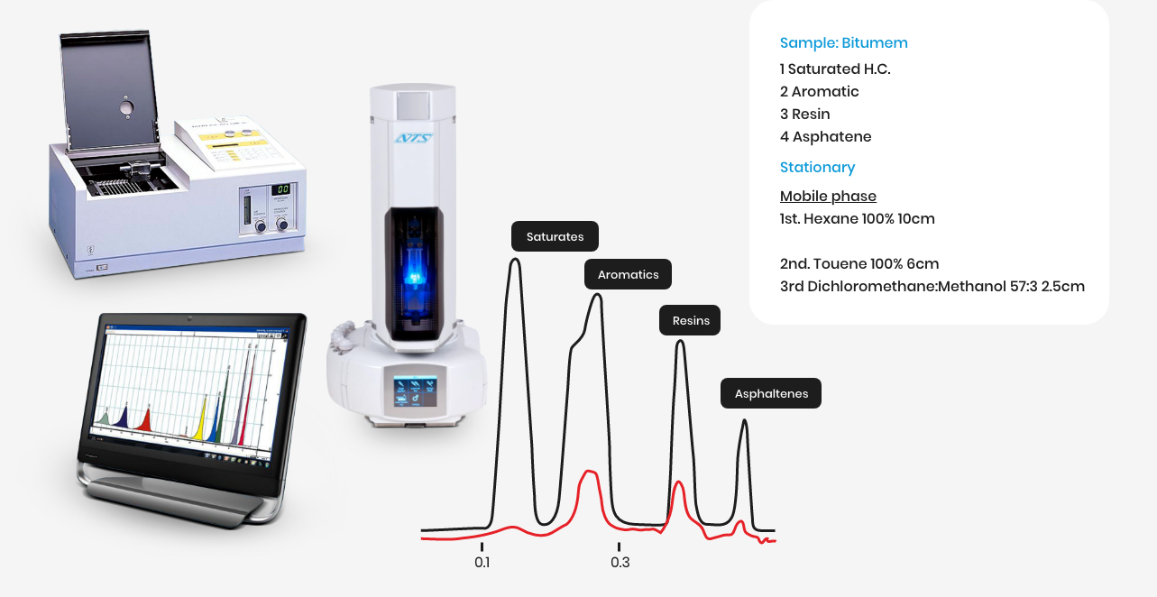 Saturates and Aromatics are determined by adsorption chromatography, through our patented Chromarod silica gel bars. Saturates are eluted with a paraffinic solvent, such as pentane or heptane. Aromatics are eluted either with paraffinic or moderately polar solvents, such as toluene. Iatroscan standard method is IP 469 which determines all four compound classes by adsorption chromatography.
